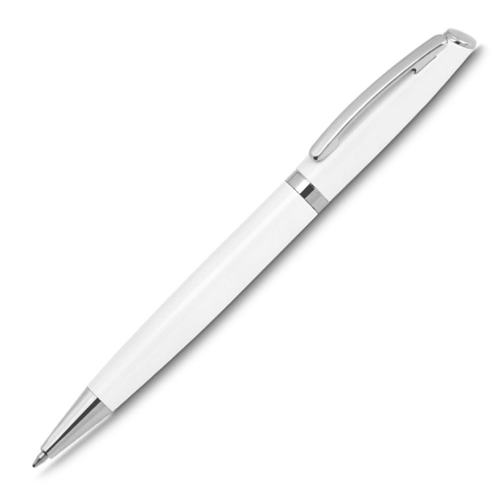 Caneta esferográfica de alumínio fosca escrita em azul.