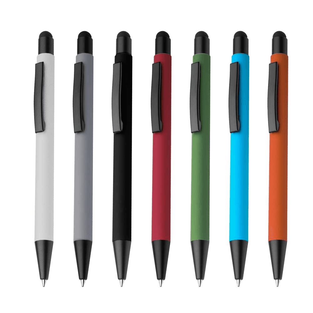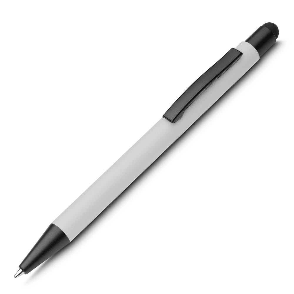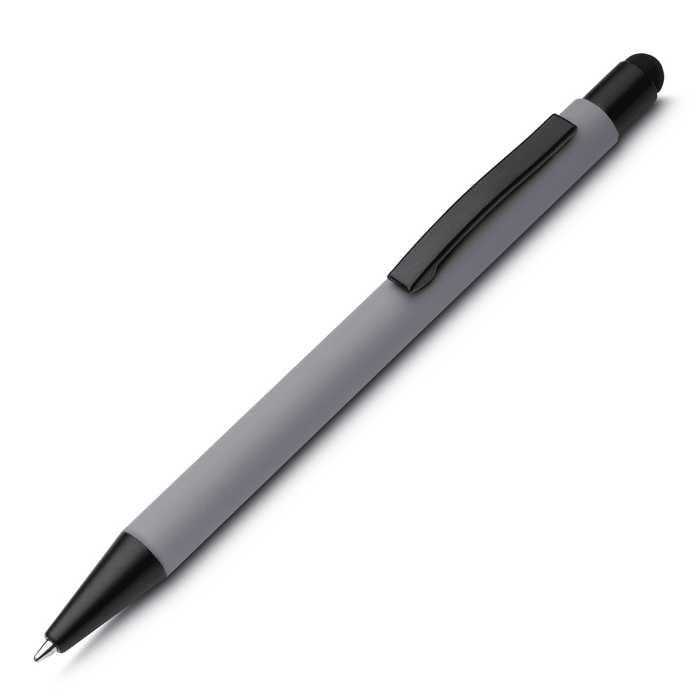 Caneta esferográfica em metal escrita em azul com corpo emborrachado. Refil tipo parker com ponta touch emborrachada.