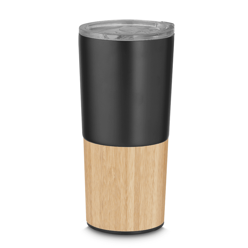 Copo térmico parede dupla em aço inox, detalhe em bambu na parte inferior, tampa plástica com anel de silicone para evitar vazamento, com capacidade de 550ml.