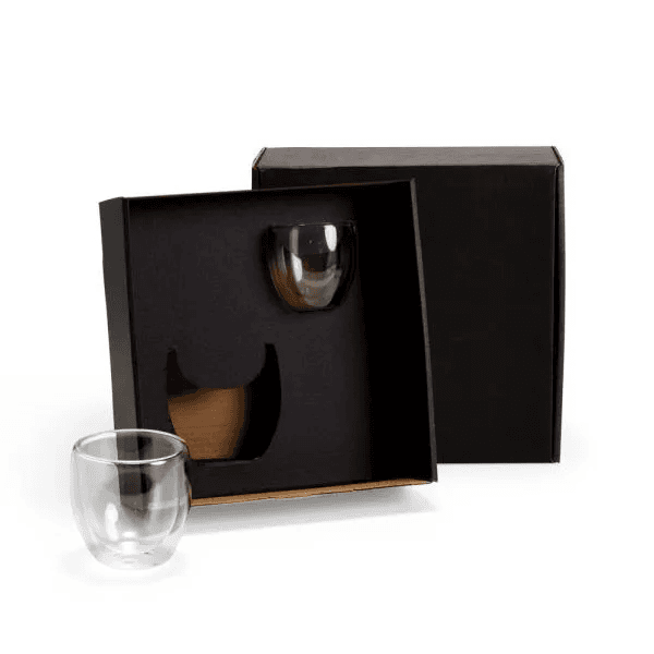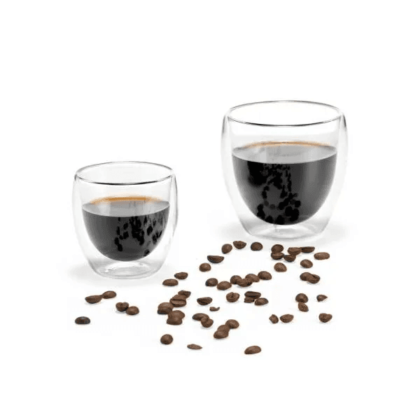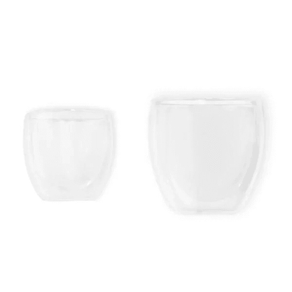 Dois copos em vidro parede dupla com capacidade de 250/100ml. Mantém a temperatura da bebida por mais tempo.