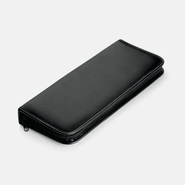 Composto por uma faca 7” em Bambu/Inox e um garfo trinchante em Madeira/Inox. Estão organizados em fita elástica preta no interior de um estojo confeccionado em poliuretano preto com toque almofadado, fechamento em zíper e acabamento em costura lateral.