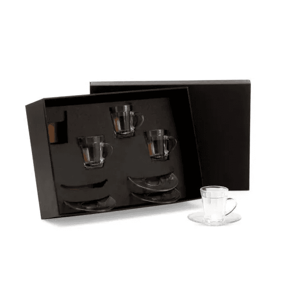 Conjunto de quatro xícaras americano com pires em vidro. Capacidade: 90 ml cada.