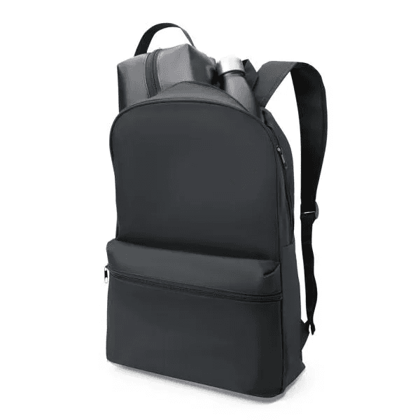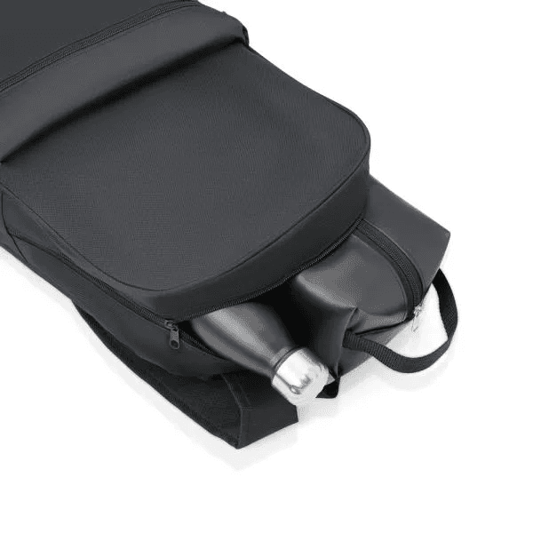 Conjunto Mochila, necessaire e garrafa. Composto por mochila preta confeccionada em Polyester 600D; necessaire com alça em material sintético na cor preta e garrafa em Aço Inox preta com tampa rosqueável.