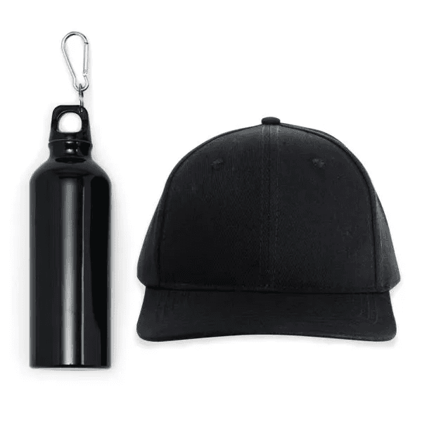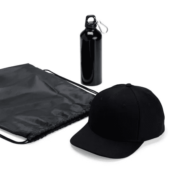 Composto por mochila sacola preta em Nylon 190D com alças ajustáveis; squeeze preto em alumínio revestido com verniz e boné.