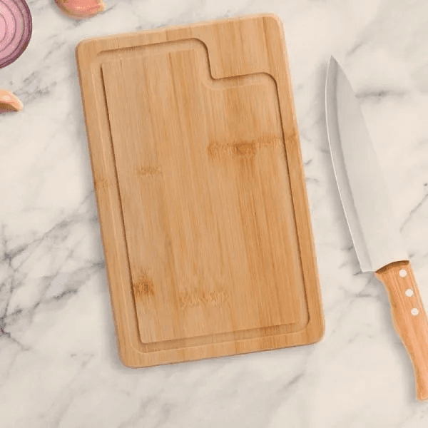 Conjunto para Churrasco. Composto por uma tábua retangular em tripla camada invertida de Bambu com sulco e uma faca 8” com cabo em Madeira e lâmina em aço Inox com rebites resistentes.