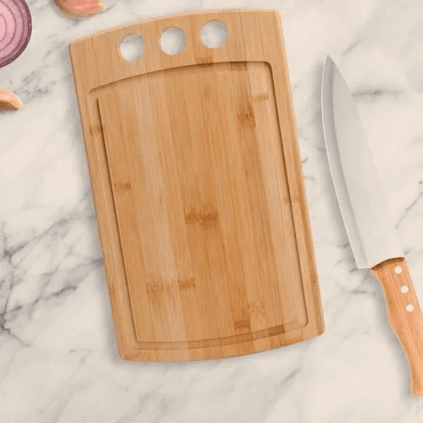 Conjunto para Cozinha. Composto por tábua com três furos em Bambu e faca 8'' em Madeira/Inox. Como cortesia, na faca 8" fazemos uma gravação com os cortes do boi.
