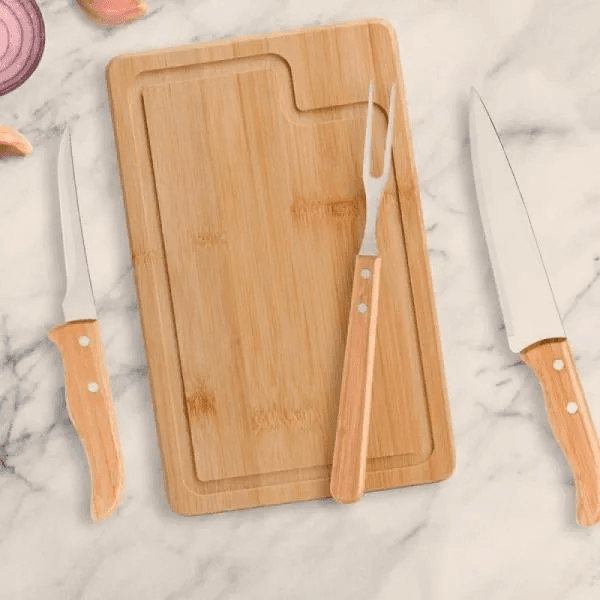 Conjunto composto por uma tábua retangular em tripla camada invertida de Bambu com sulco; faca 7” em Bambu/Inox; garfo trinchante e faca 5” para desossar em Madeira/Inox.