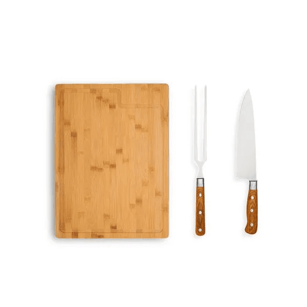 Conjunto para Churrasco. Composto por tábua em Bambu para Churrasco; faca e garfo premium em Madeira / Inox.