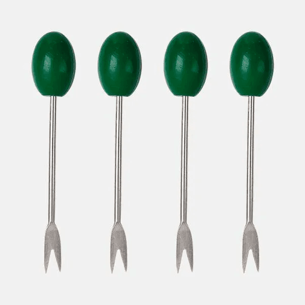 Conjunto para petisco em Bambu/Fibra de bambu. Acompanha cinco potes em fibra de bambu; Quatro garfos em aço Inox com ponta em formato de azeitona e base em bambu com alças em aço Inoxidável.