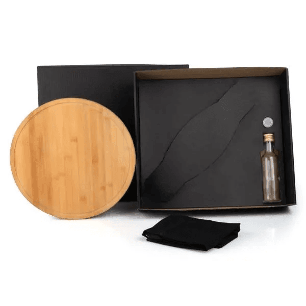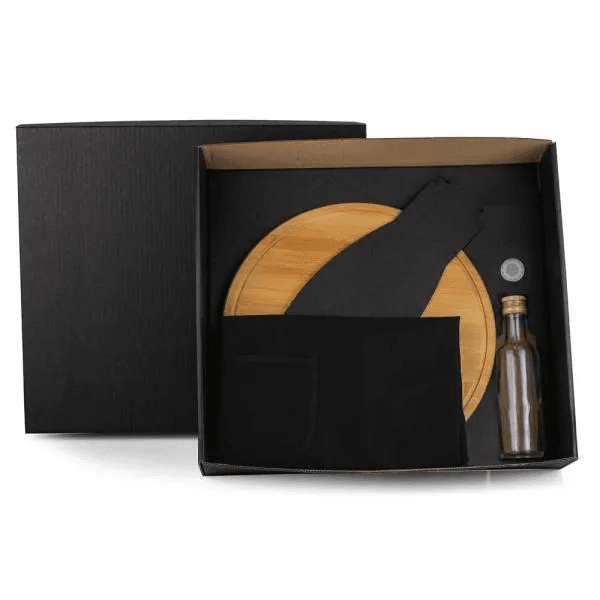 Comporto por tábua para Pizza em Bambu e espátula para Pizza; garrafa em vidro para azeite e avental em Brim Preto.