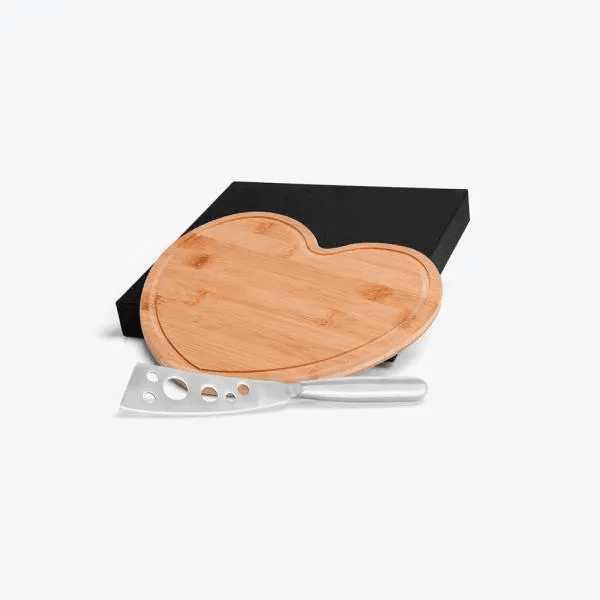 Conjunto para queijo em Bambu/Inox. Conta com tábua em formato de coração em bambu e faca em aço Inox.