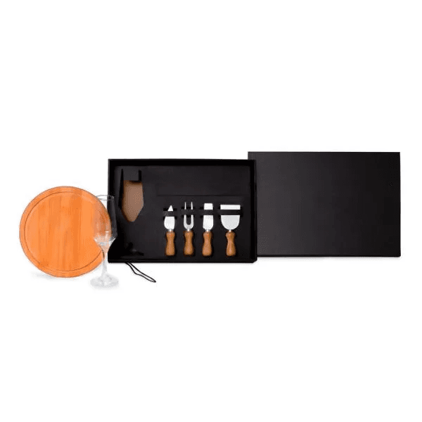 Conta com tábua em Bambu; Duas facas, uma espátula e um garfo para Queijo em madeira/inox; Taça em vidro.