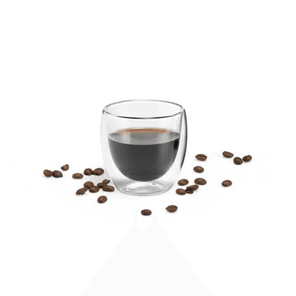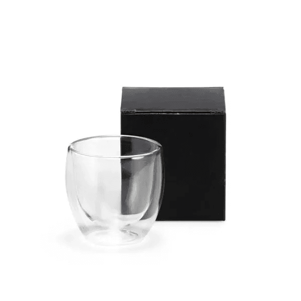Copo em vidro parede dupla com capacidade de 100 ml. Mantém a temperatura da bebida por mais tempo.