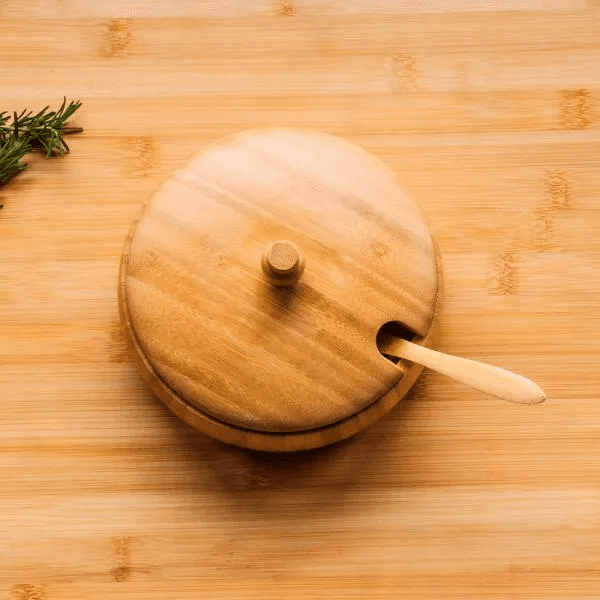 Farinheira em bambu. Conta com cumbuca, tampa e colher.