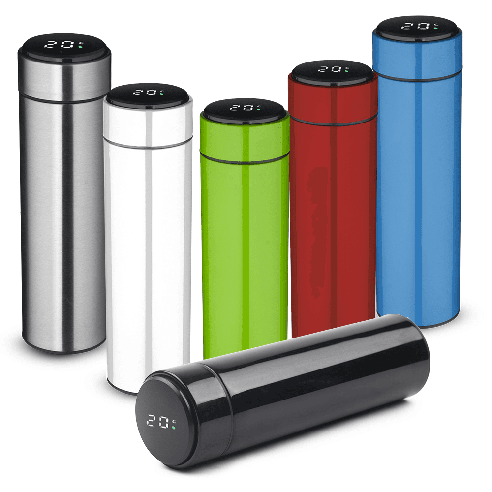 Display LED com termômetro digital na tampa para indicar a temperatura do líquido. Possui tampa removível para a troca da bateria CR2032.