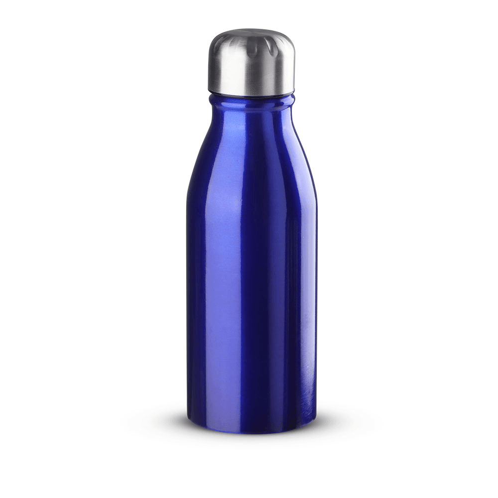 Garrafa em alumínio com capacidade 500ml. Tampa rosqueável em inox com anel de silicone.