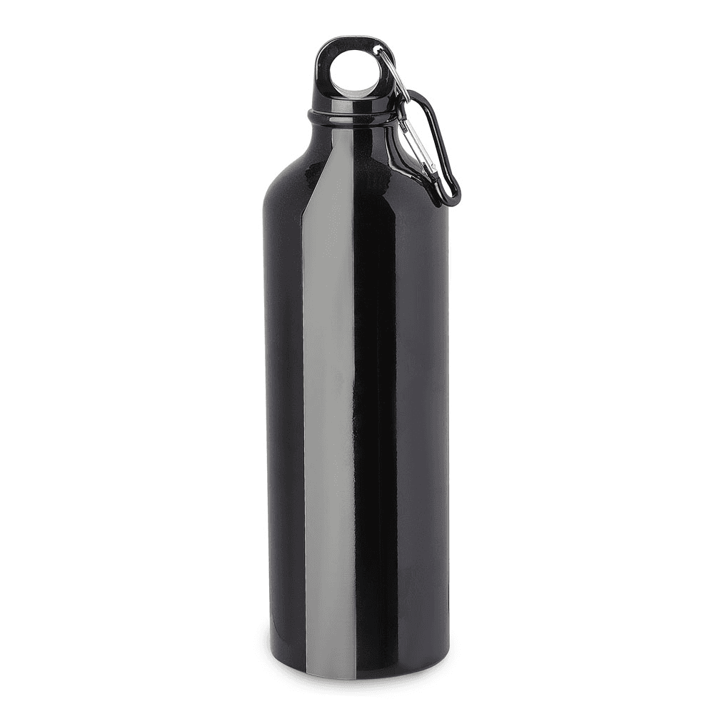 Garrafa em alumínio com capacidade de 750ml. Tampa de plástico rosqueável com mosquetão colorido. Pintura metálica.