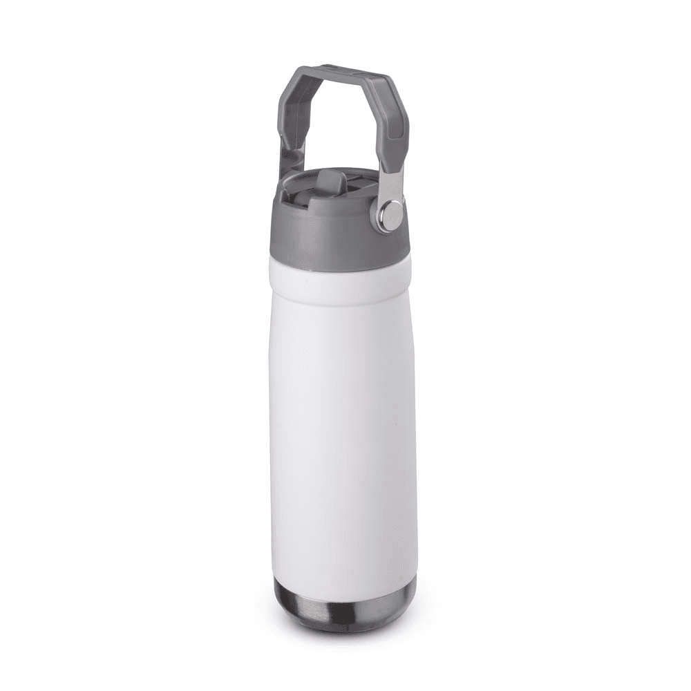 Garrafa térmica em aço inox com parede dupla Isolada a vácuo com capacidade de 700ml. Tampa rosqueável em plástico, com alça plástica para transporte. Bico por meio de sucção com canudo.