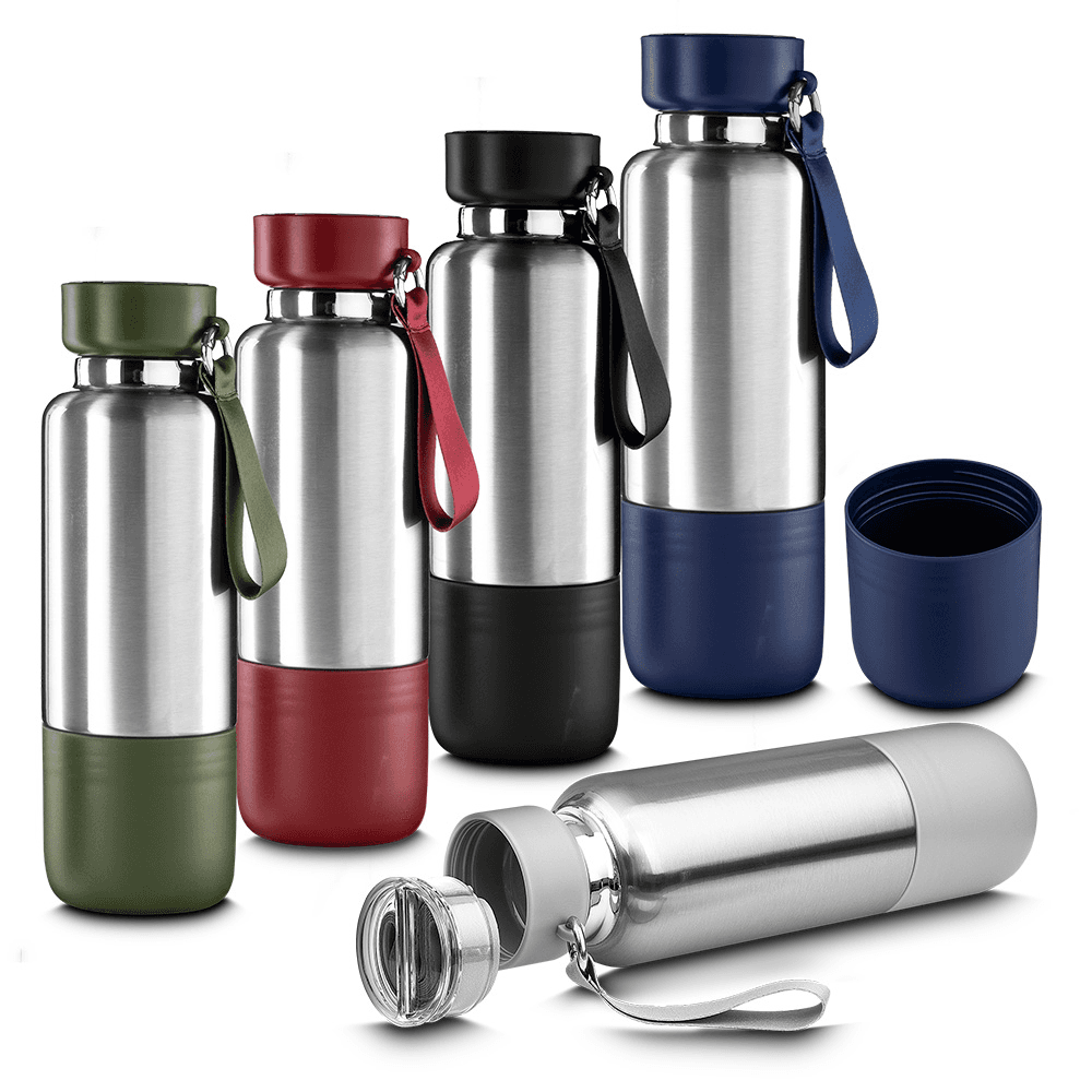 Garrafa térmica em aço inox com parede dupla isolada a vácuo e capacidade de 500ml. Alça de transporte em cordão. Tampa rosqueável, vedada por um anel de silicone e com uma argola tipo mosquetão para o cordão. Parte superior da tampa possui um compartimento para pequenos objetos que acompanha um cordão adicional de 68cm para substituição e cordão de mão com 10cm. Possui copo adicional rosqueável na parte inferior da garrafa de 250ml.