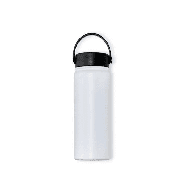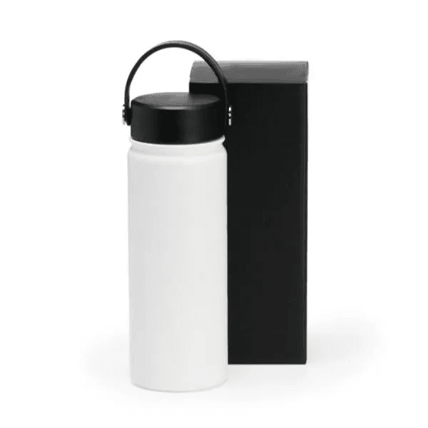 Garrafa em Inox na cor branca, confeccionada com dupla camada. Conta com tampa plástica rosqueável e alça de mão. Mantém a temperatura da bebida por mais tempo.