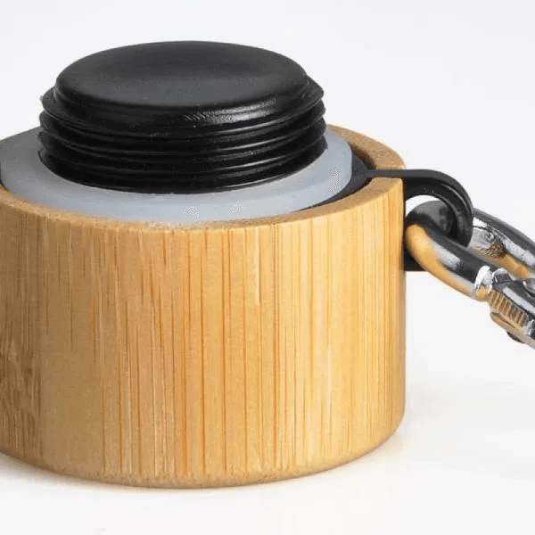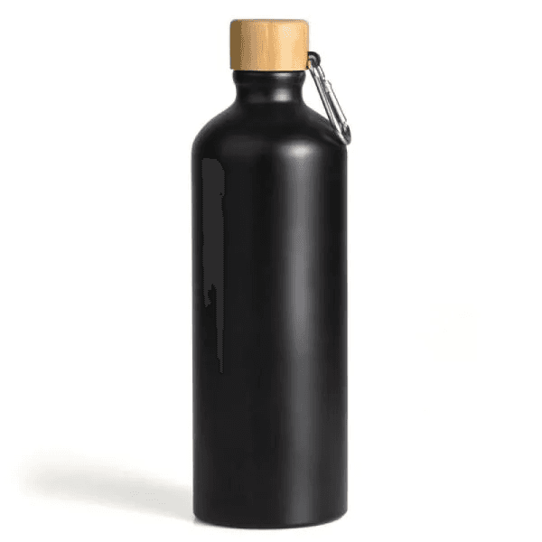 Garrafa em alumínio na cor preta com capacidade de 1 litro. Possui tampa rosqueável em Bambu com mosquetão.