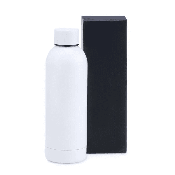 Garrafa em Inox na cor branca, confeccionada com uma segunda parede de Inox para alta preservação de temperatura tanto de líquidos gelados, quanto de líquidos quentes.