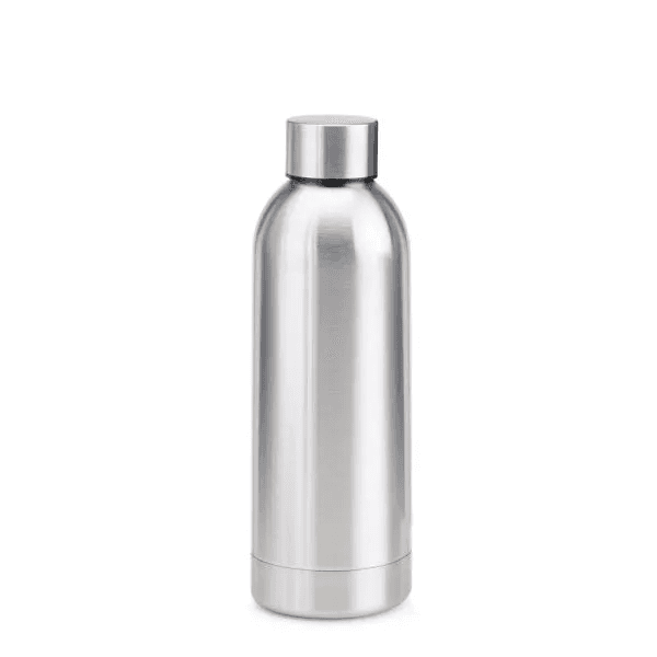 Garrafa em Inox na cor prata, confeccionada com uma segunda parede de Inox para alta preservação de temperatura tanto de líquidos gelados, quanto de líquidos quentes.