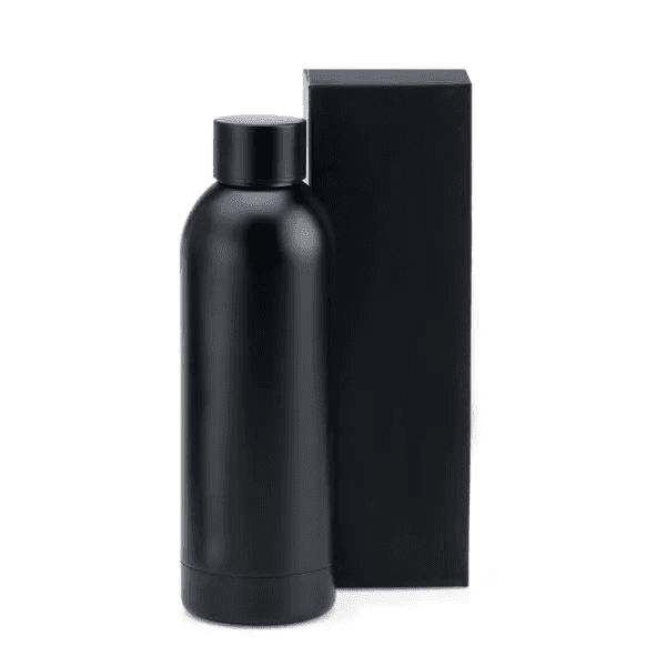 Garrafa em Inox na cor preta, confeccionada com uma segunda parede de Inox para alta preservação de temperatura tanto de líquidos gelados, quanto de líquidos quentes.