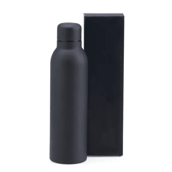 Garrafa preta em metal Inox, confeccionada com dupla parede em Inox, assim conseguindo manter e preservar os líquidos gelados e quentes por mais tempo.