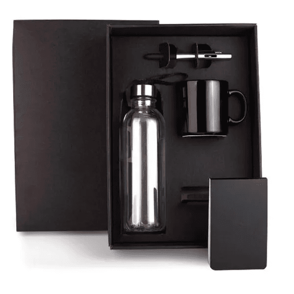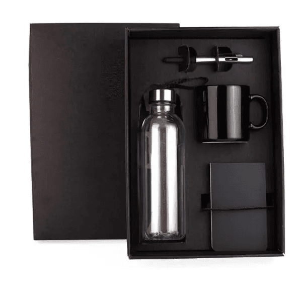 Esse kit conta com garrafa transparente em PET; caneca em cerâmica preta; bloco para anotações preto e caneta esferográfica em ABS prata.