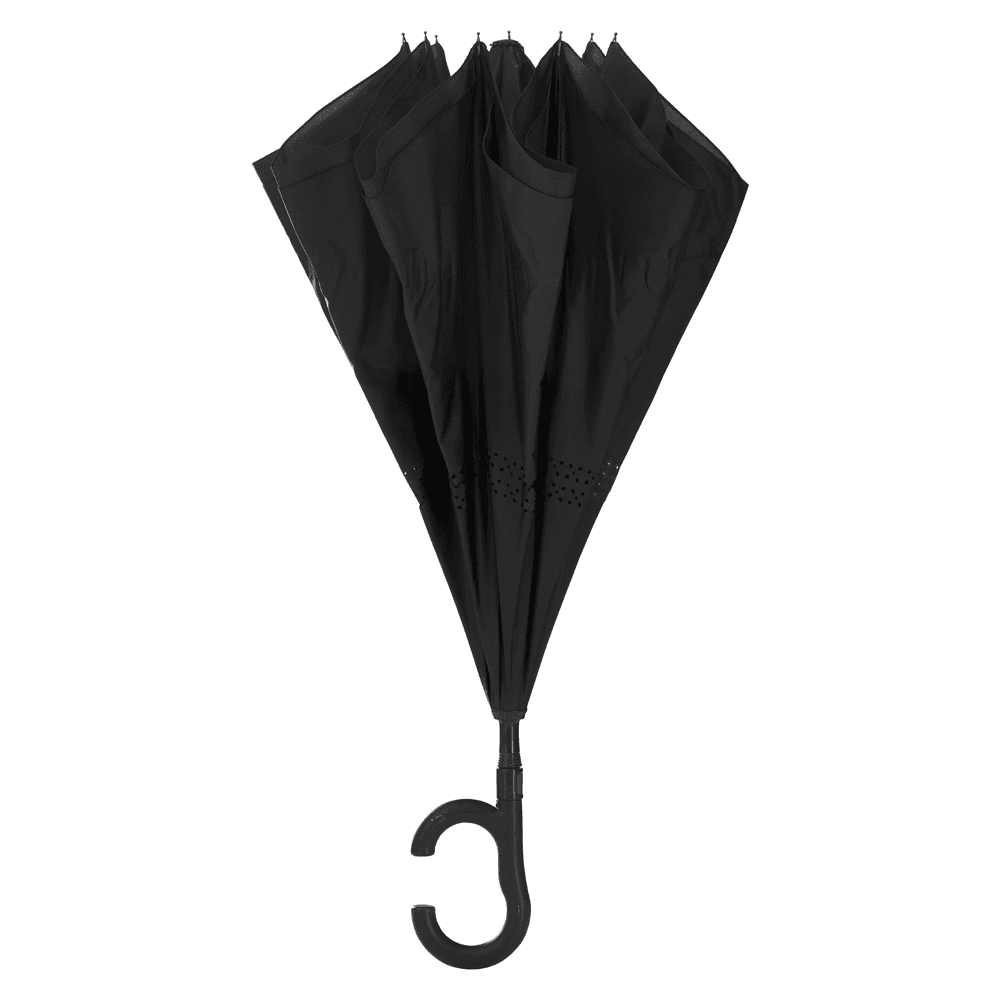 Guarda-chuva invertido com cabo plástico e haste de metal, botão acionador para abertura automática, tecido ponge chinês, seda crua Poliester 190T Pongee, oito varetas.