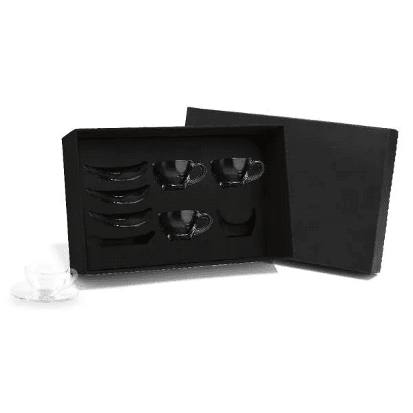 Jogo de xícaras. Kit para café contendo quatro xícaras com pires em vidro. Capacidade: 90 ml cada xícara.