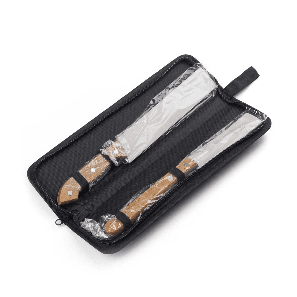 Kit Churrasco contendo 3 peças: Estojo de Nylon com alça para pendurar, uma Faca com 31,7 cm e um Garfo trinchante, ambos com cabos de madeira e aço inox.