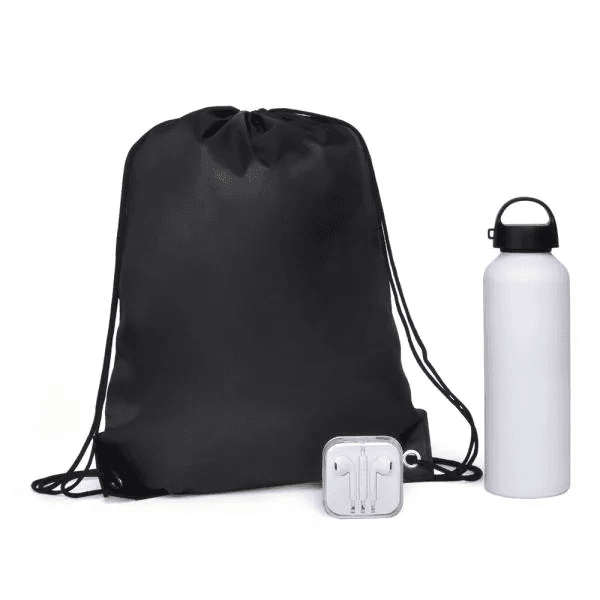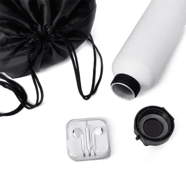 Garrafa branca em alumínio com capacidade de 600 ml; mochila sacola preta em Nylon 190D com alças ajustáveis e fone de ouvido branco com microfone, controle de volume e estojo plástico.