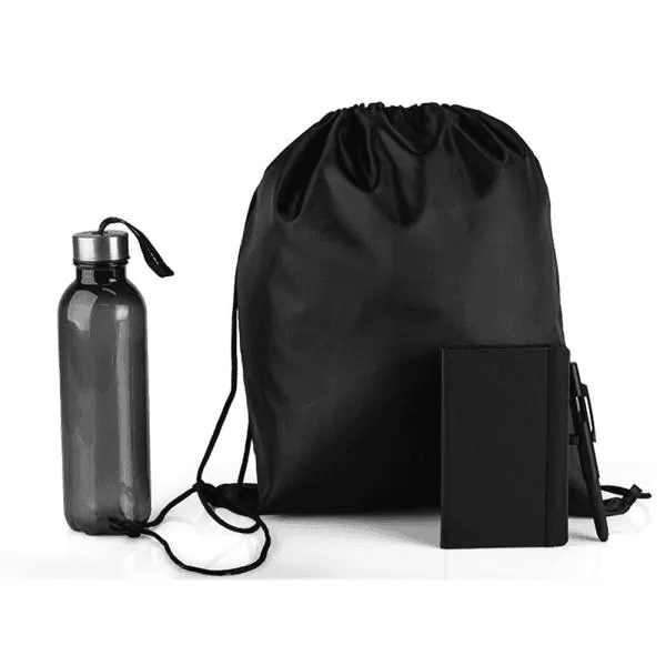 Kit boas vindas. Conta com mochila preta em nylon 420; garrafa preta em PET; caderno para anotações preto com capa dura e caneta esferográfica em ABS preta.