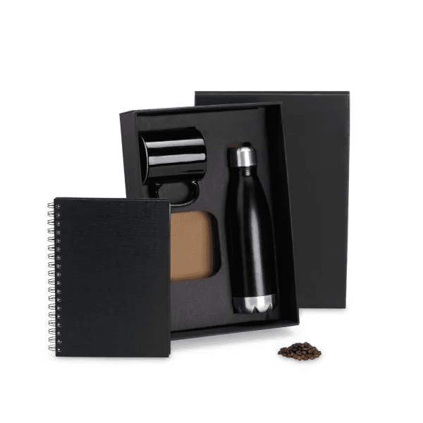 Conta com squeeze em aço inox preto, caneca em cerâmica preta e caderno preto.