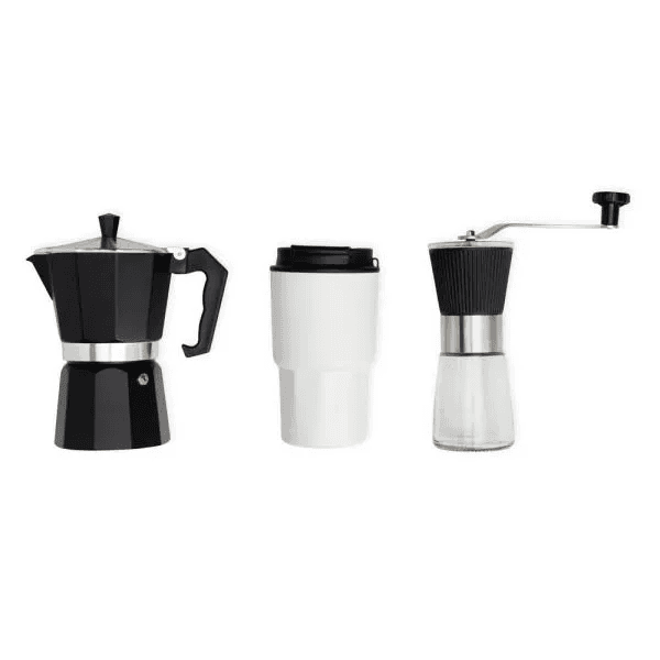 Kit composto por cafeteira italiana; moedor de café em Vidro/Inox e copo térmico branco com tampa.