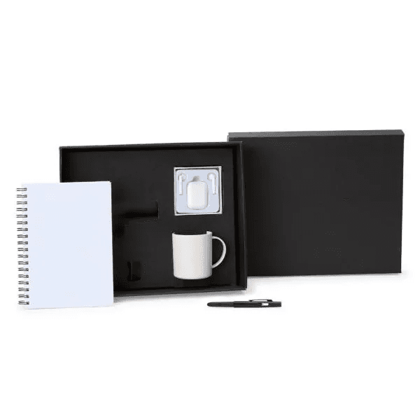 Kit caneca em fibra de Bambu e acessórios. Composto por caneca em fibra de Bambu/PP; fone de ouvido Bluetooth com comandos touch, microfone e case carregador de fechamento magnético, acompanha USB Lightning; caderno para anotações wire-o branco com capa dura e caneta esferográfica em ABS preta.