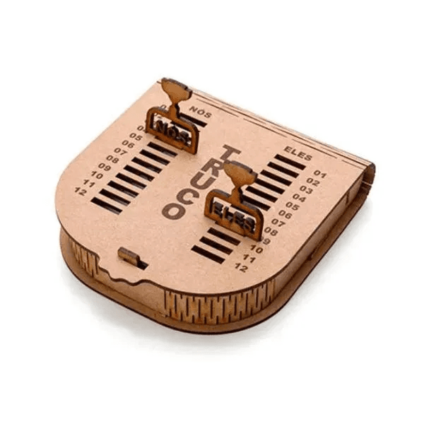 Kit para Churrasco, Cerveja e Truco. Composto por tábua com três furos em Bambu; garfo trinchante e faca 8" em Madeira/Inox; quatro copos de Cerveja em vidro; caixa para truco com jogo de cartas, marcador de tentos e jogos em MDF. Como cortesia, na faca 8" fazemos uma gravação com os cortes do boi.