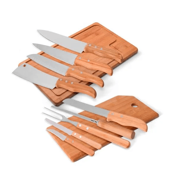 Kit para Churrasco e Cozinha. Composto por tábua para cozinha e tábua para Churrasco em Bambu; faca 7", faca 7" para frios, faca 7" para pão, faca 3" para legumes e chaira em Bambu/Inox; faca 8", faca 4", faca 5" para desossar, cutelo 6" e garfo trinchante em Madeira/Inox. Como cortesia, na faca 8" fazemos uma gravação com os cortes do boi.