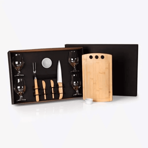 Kit para Churrasco, Petisco e Cerveja. Conta com tábua três furos e duas espátulas em Bambu; faca 7'' em Bambu/Inox e garfo trinchante em Madeira/Inox. dois ramekins em porcelana; quatro taças de Cerveja em vidro. Como cortesia, na faca 7" fazemos uma gravação com os cortes do boi.