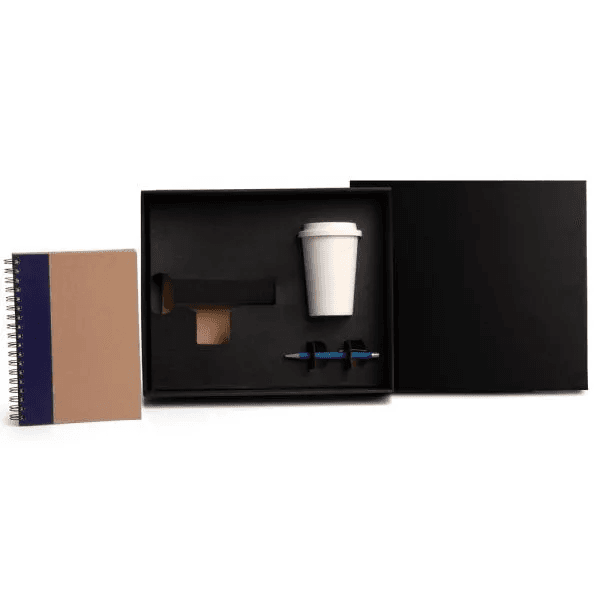 Kit copo em fibra de Bambu, caderno e caneta. Composto por copo em Fibra de Bambu/PP; caderno com 100 folhas para anotações wire-o com capa dura na azul e caneta esferográfica em alumínio azul.