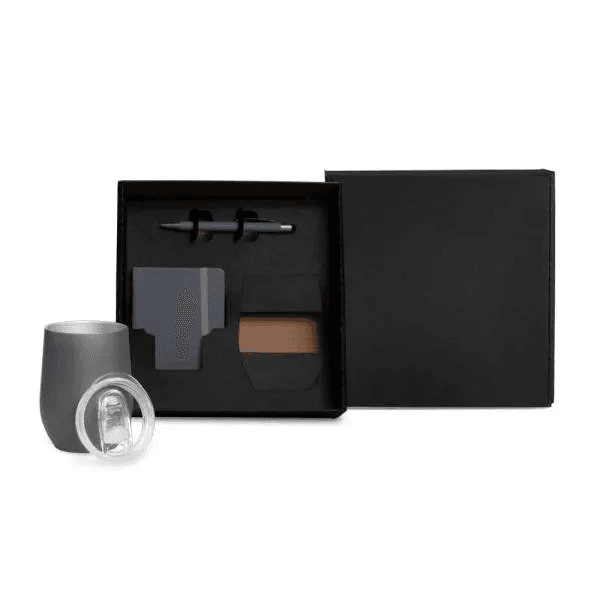 Composto por copo térmico cinza com tampa 340ml, confeccionado com dupla parede de inox, isolada a vácuo; caderno para anotações cinza com capa dura e caneta esferográfica em alumínio cinza.