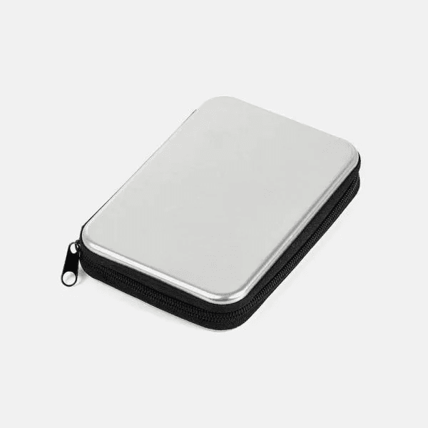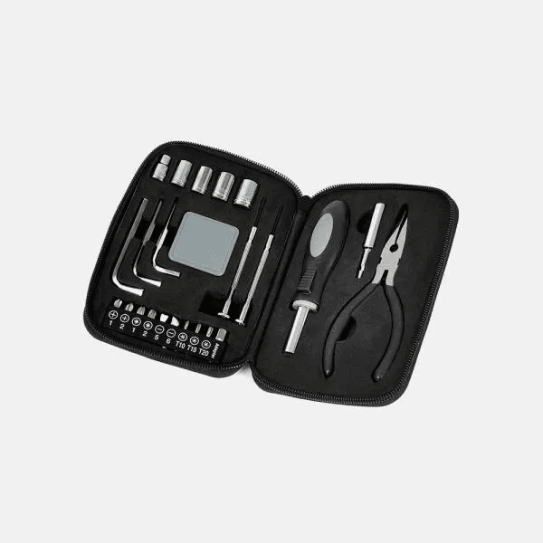 Kit com alicate, trena de 1m, chave canhão de 6, 7, 8, 9 e 10mm, ponteiras com nove peças, sendo quatro phillips, duas fendas e três torx, um adaptador para ponteira, duas chaves de precisão, sendo uma phillips e uma fenda e três allen de 4, 5 e 5,5mm. Estojo com acabamento externo em alumínio e fechamento em zíper.
