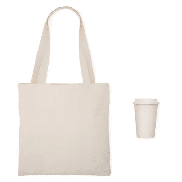 Kit ecológico. Composto por copo em fibra de Bambu/PP e sacola/ecobag de algodão com alças de 60cm.