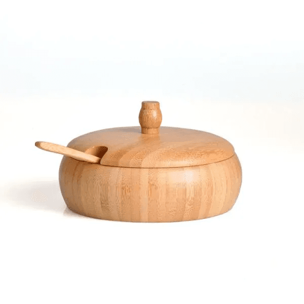 Conta com cumbuca, tampa e colher. Conta também com saleiro em bambu; Estão perfeitamente acomodados em uma caixa para presentear.