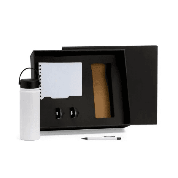 Composto por garrafa em Inox na cor branca, confeccionada com dupla camada; caderno para anotações wire-o branco com capa dura; caneta esferográfica em alumínio branca.