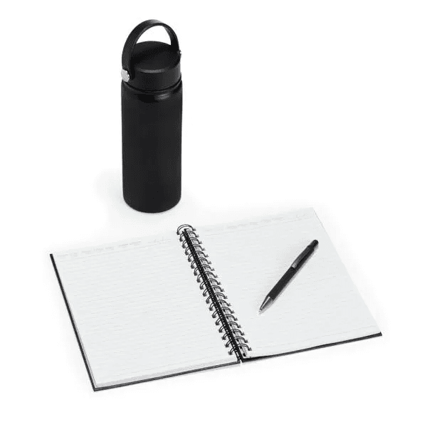 Composto por garrafa em Inox na cor preta, confeccionada com dupla camada; caderno para anotações wire-o preto com capa dura; caneta esferográfica em alumínio preto.