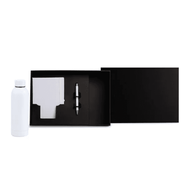 Composto por garrafa branca com dupla parede de Inox; caderno para anotações branco com capa dura e caneta esferográfica em alumínio branca.