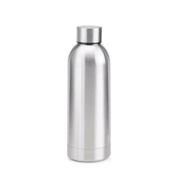 Composto por garrafa prata com dupla parede de Inox; caderno para anotações cinza com capa dura e caneta esferográfica em alumínio cinza.